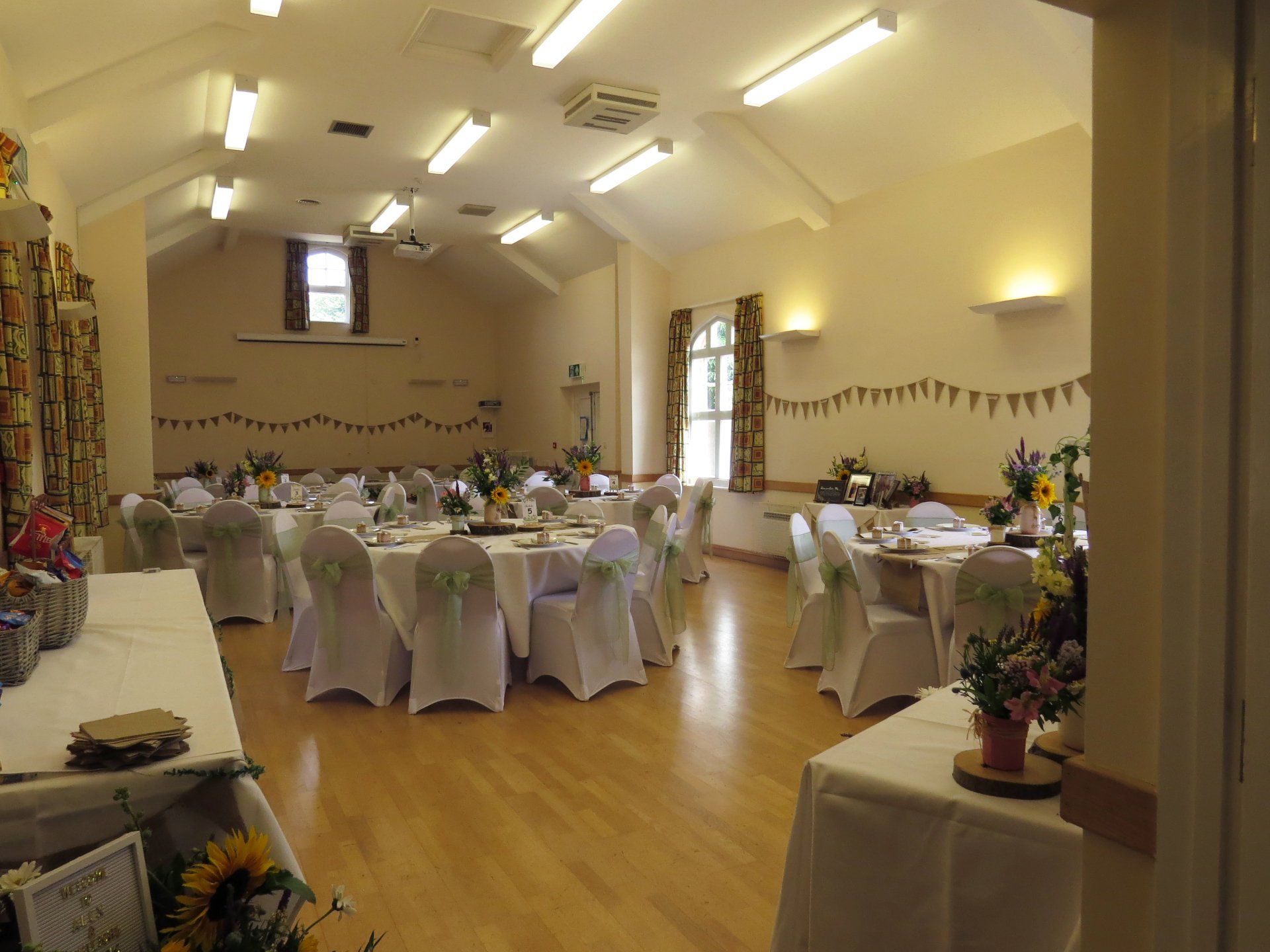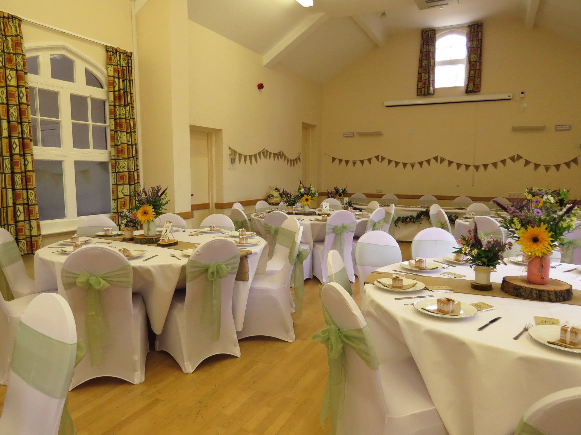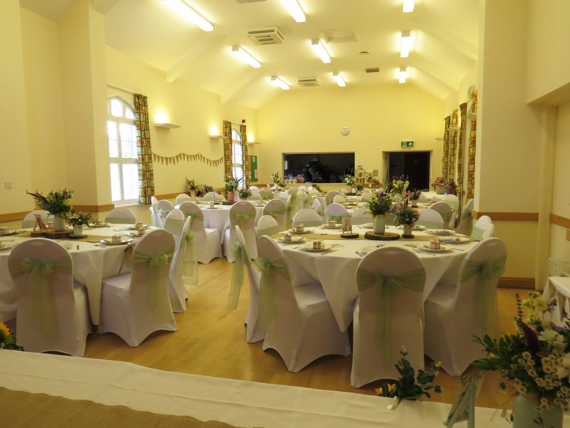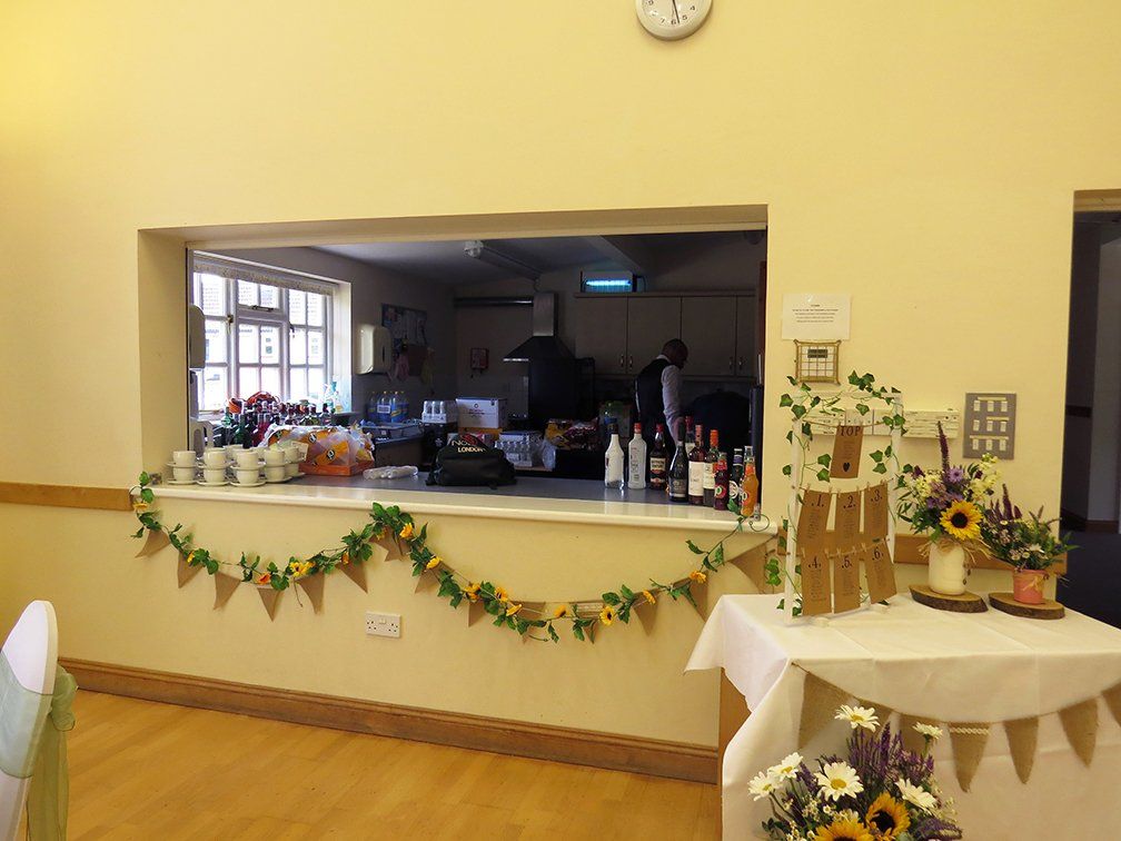 The village hall can be decorated (subject to certain criteria laid down in the terms and conditions). There are round and long tables to lay out in your chosen design.